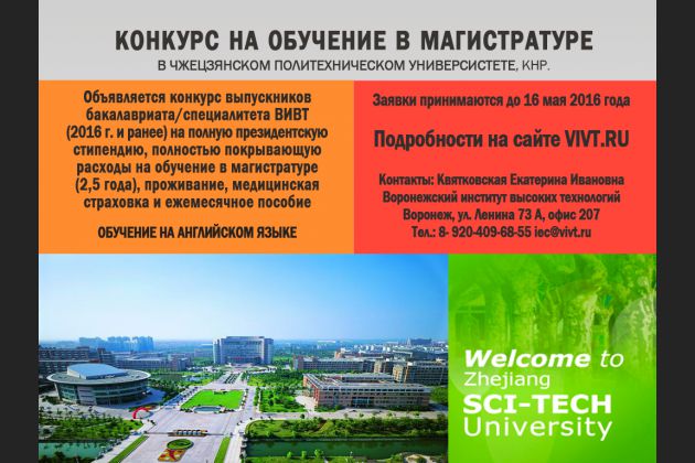 Объявляется конкурс выпускников бакалавриата/специалитета ВИВТ (2016 года и ранее) на полную президентскую стипендию, полностью покрывающую расходы на обучение в магистратуре (2,5 года), проживание, мед.страховка и ежемесячное пособие в Чжэцзянском политехническом университете, КНР. Обучение на английском языке. Список дисциплин магистратуры Полный перечень документов и условия участия в конкурсе на президентскую стипендию смотрите здесь.