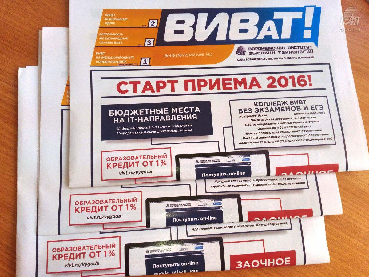 14 июля в период основной волны приема документов на очную форму обучения в Воронежском институте высоких технологий состоялась встреча абитуриентов и их родителей с администрацией вуза и руководителем IT–направлений ВИВТ, кандидатом технических наук, доцентом Ю. П. Преображенским.26-29 июня 2016 г. сотрудница Регионального центра устной истории, действующего в структуре ВИВТ, О. И. Кулинченко приняла участие в XVI ежегодной летней сессии Центра «Холокост» «Уроки Холокоста – путь к толерантности». Семинар предназначен для учителей школ, сотрудников средних специальных и высших учебных заведений, институтов повышения квалификации с целью обучения, а также обмена опытом в области преподавания темы Холокоста.